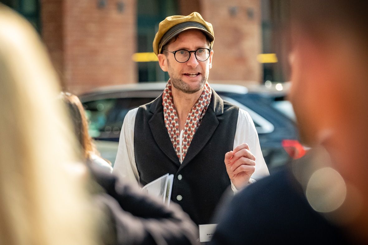Arne Krasting, Jahrgang 1975, gebürtiger Hamburger und Mitgründer der Agentur Zeitreisen GbR, lebt seit einem Vierteljahrhundert in Berlin. Seit 2020 führt er Gäste auf den Spuren von Babylon Berlin durch die Hauptstadt. Der studierte Historiker – Geschichte, Französisch und Europäische Ethnologie in Freiburg, Paris und Berlin – spricht ruhig, aber mit spürbarer Begeisterung, wenn es um die Zwanziger geht. In Jeans und lässigem Style wirkt er zugleich geerdet und voller Energie – jemand, der lieber draußen unterwegs ist, als im Büro zu sitzen. Er bringt seinen Gästen nicht nur Drehorte, sondern auch die bewegte Geschichte dieser Zeit näher.